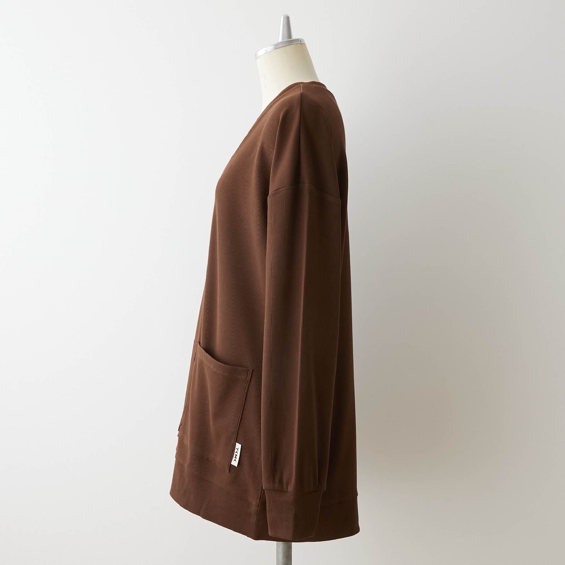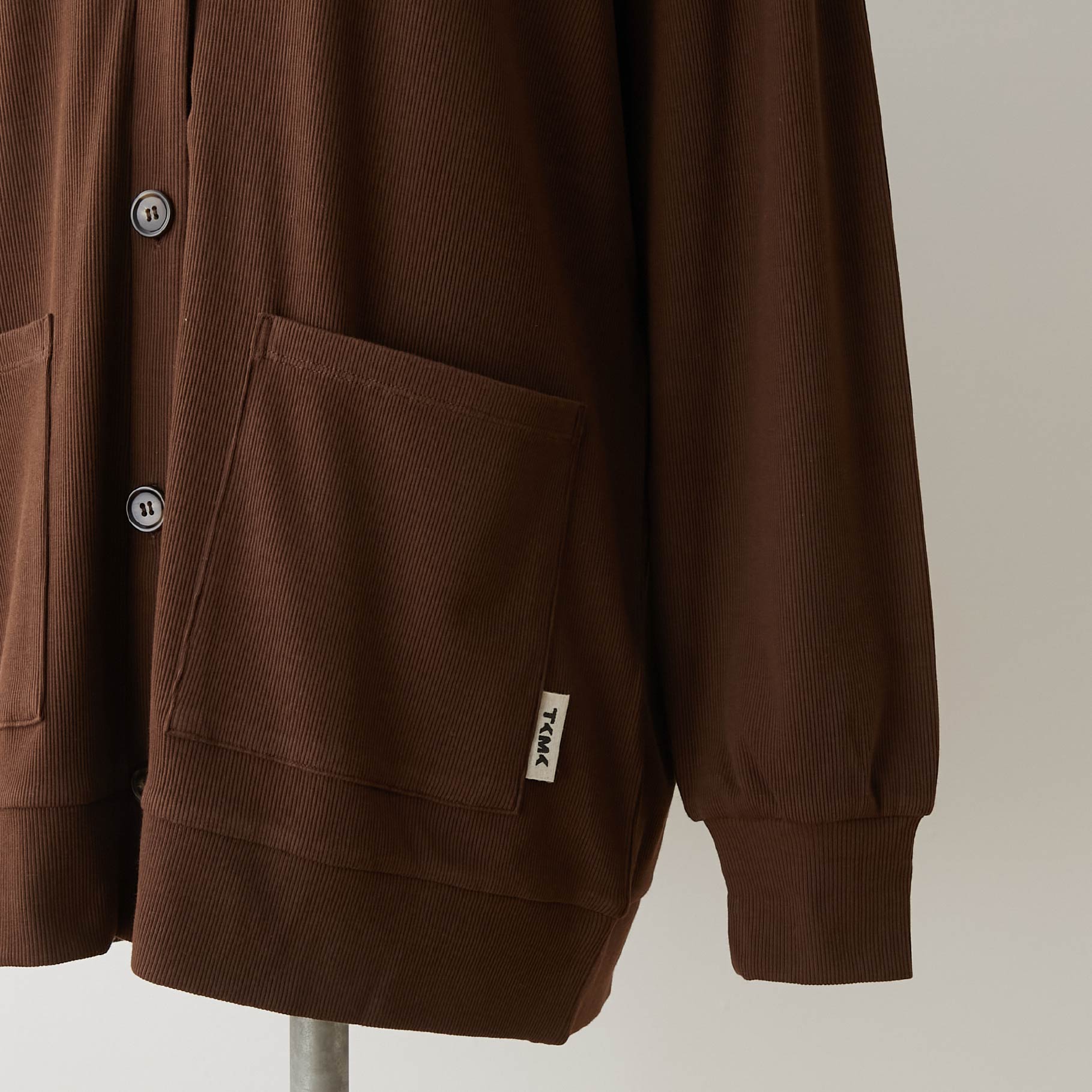 ・カーディガン:オーバーサイズシルエット。深めVネックと大きめパッチポケット。TKMKオリジナルピスネーム付き。(サイズ1とサイズ2では身ごろ丈の差が6cmあります。)