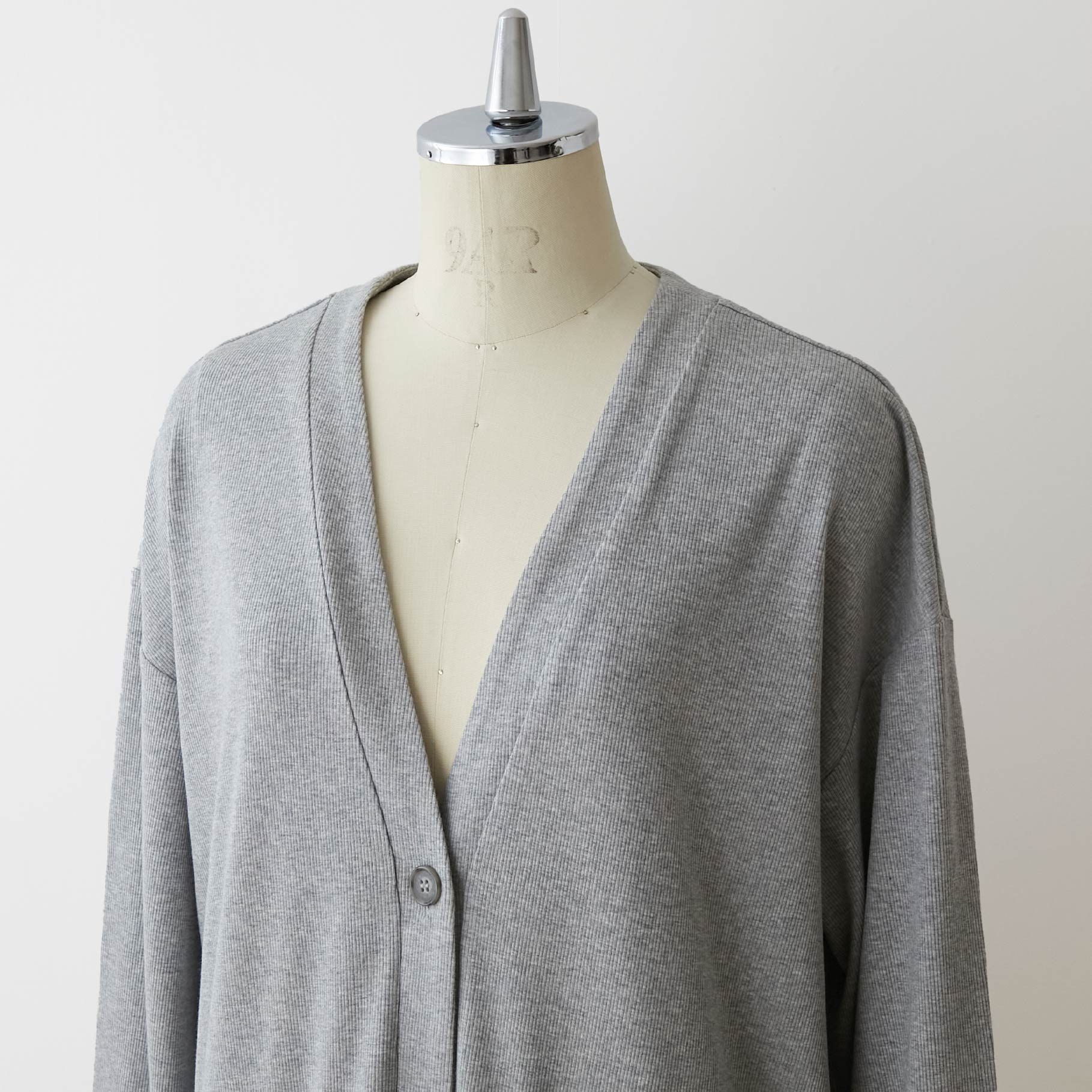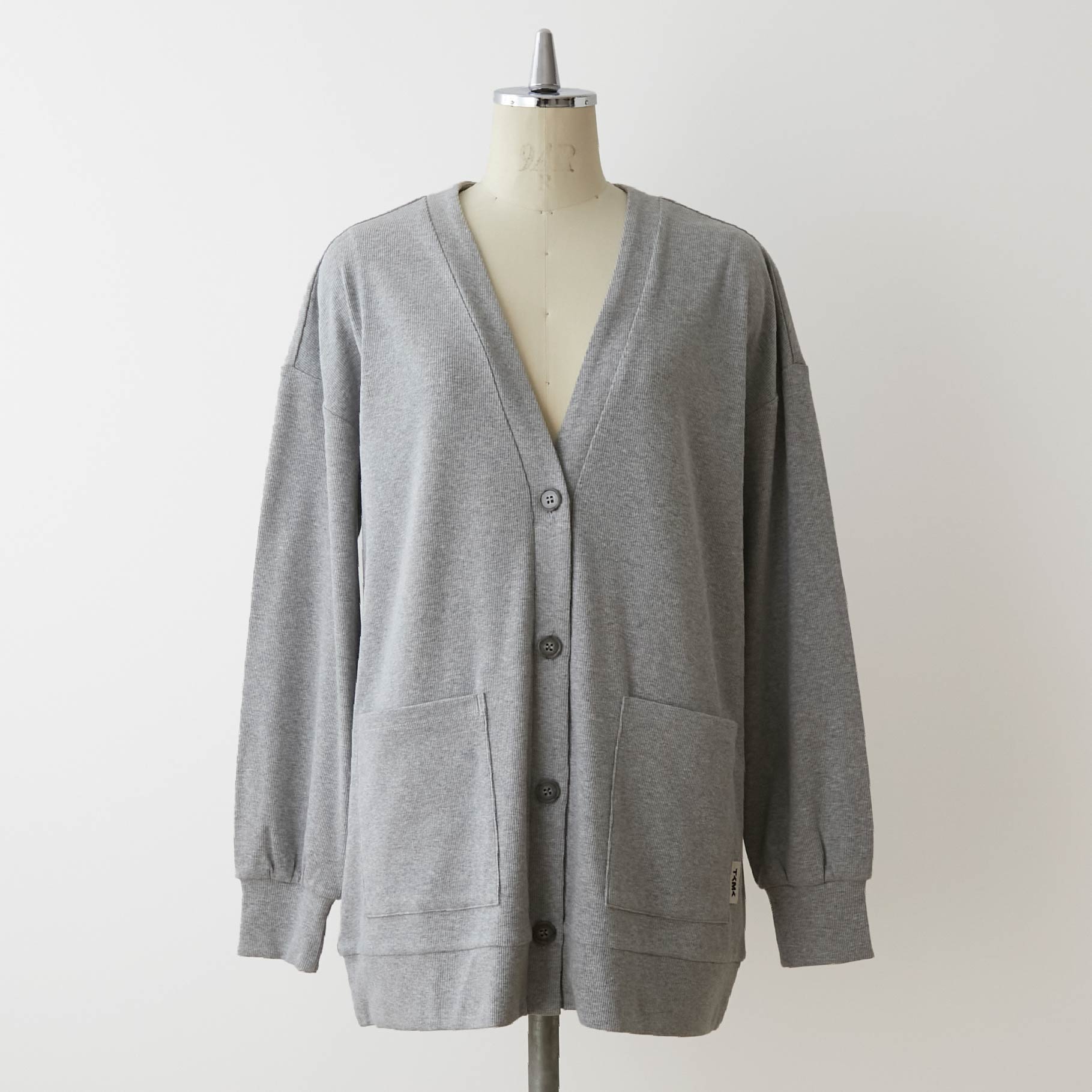 ・カーディガン:オーバーサイズシルエット。深めVネックと大きめパッチポケット。TKMKオリジナルピスネーム付き。(サイズ1とサイズ2では身ごろ丈の差が6cmあります。)