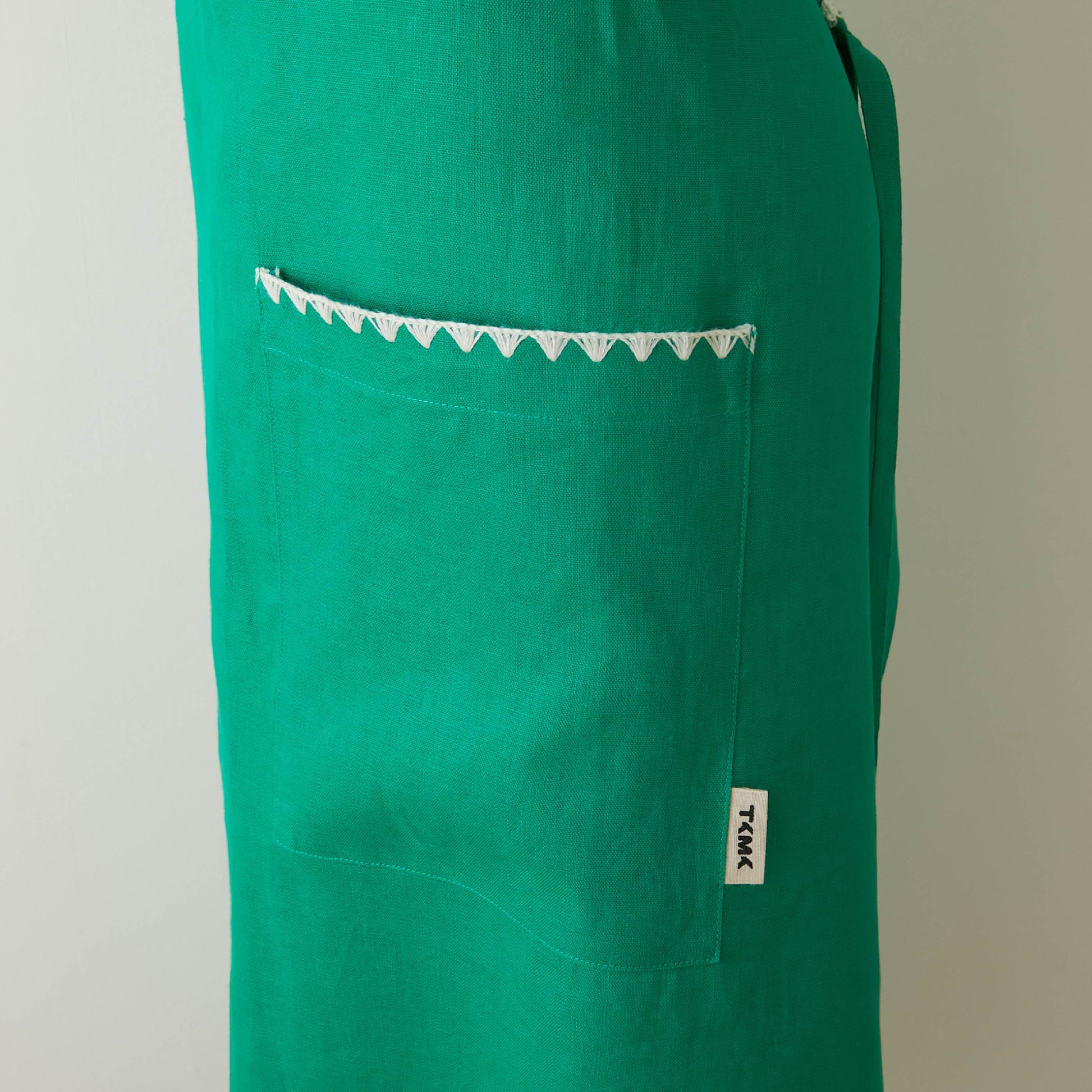 リネン100%のTKMKリネンエプロン。すっきりとしたシルエットに、胸元とポケットにあしらったトリミング刺繍がアクセント。